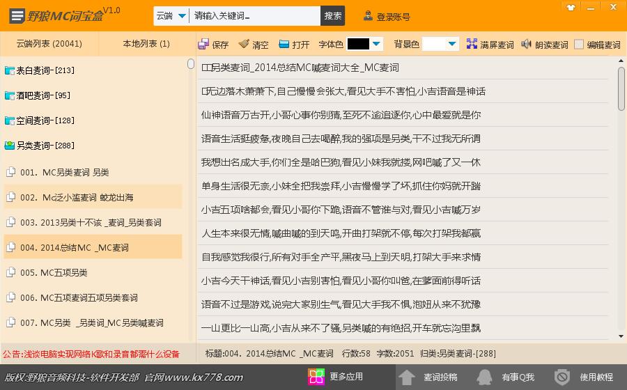 野狼MC词宝盒,是一款优秀的MC词幕专用软件.集成了表白麦词,酒吧麦词,空间麦词,另类麦词,综合麦词,经典麦词,说唱麦词等上万首在线词库数据,同时收录了MC九局,MC小洲,MC小月…
